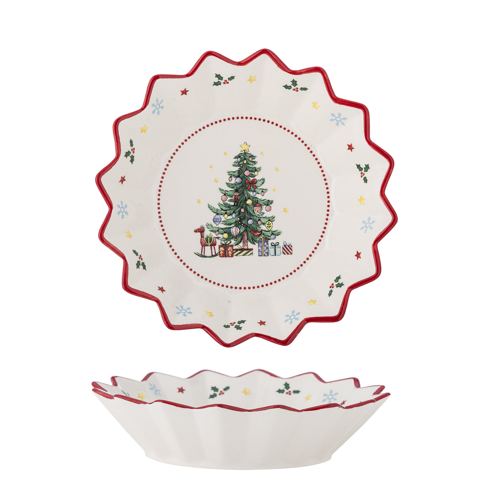 Naive Skålen fra Bloomingville charmerer med sit detaljerede juletræsmotiv og klassiske julefigurer. Den håndmalede røde kant tilfører et festligt touch og fremhæver skålens bølgede form. De håndmalede detaljer sikrer, at hver skål er helt unik.