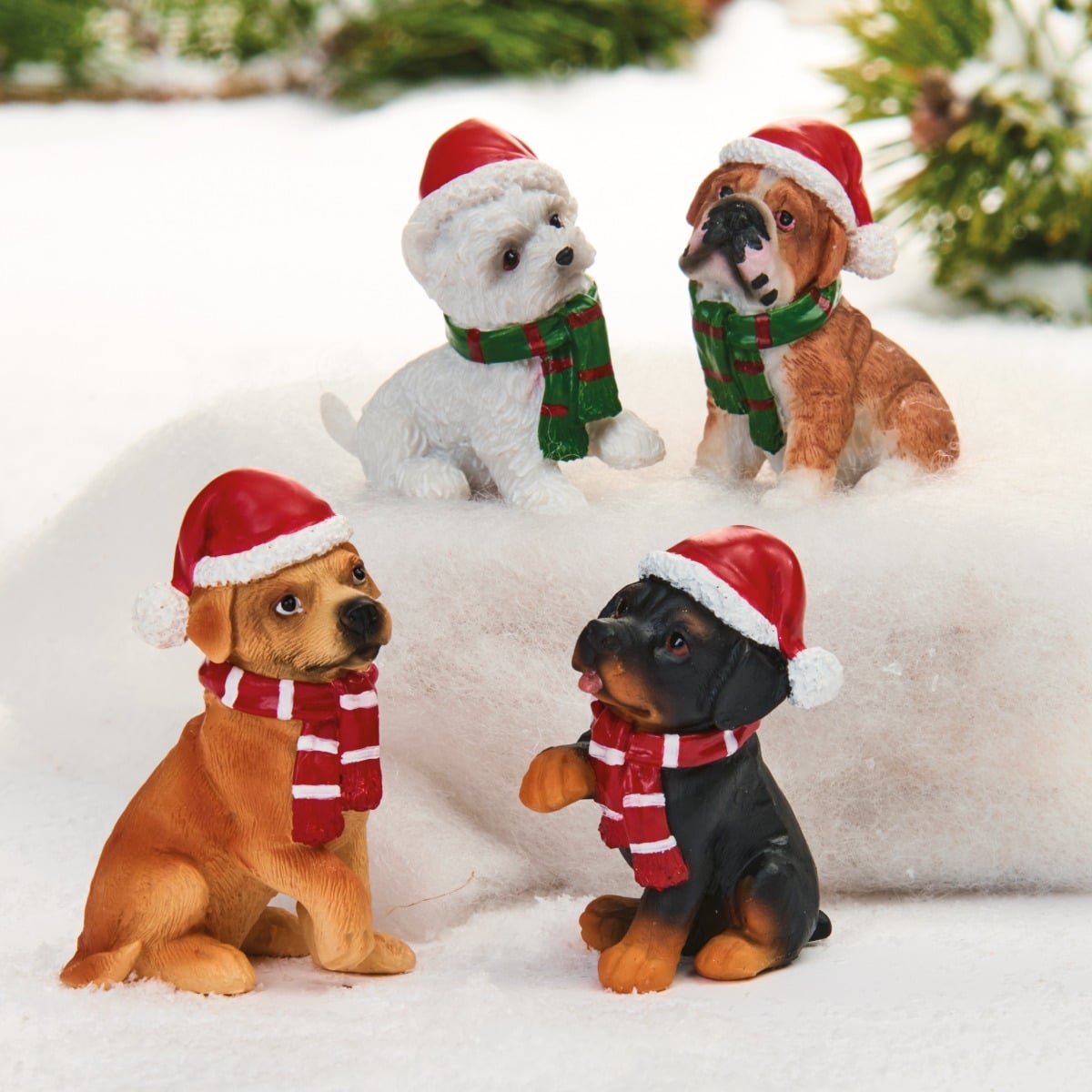 Det er koldt derude i kulden, så hundene har taget de varme nissehuer og halstørklæder på. Hundene måler 5 cm i højden. Findes i fire varianter. Fremstillet i polyresin.Pakket med 1 stk.