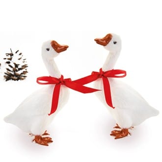 Julegås. Julegåsen måler 13 cm i højden og findes i to varianter med sløjfen på hver sin side af halsen.Pakket med 1 stk.