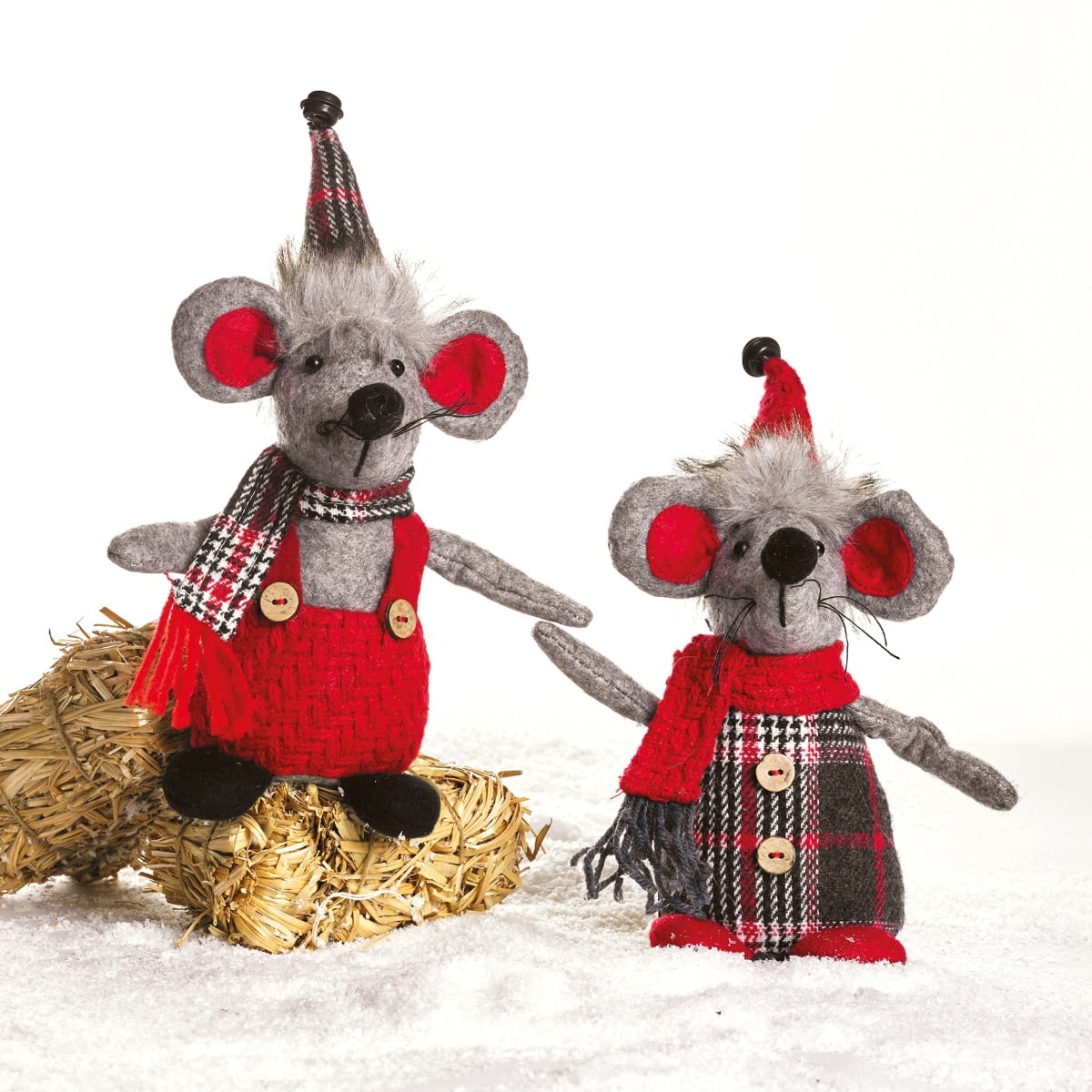 Julemus med fint tøj. Søde og bløde julemus i stof iført deres fineste julegarderobe. Julemusene er 15 cm i højden og findes i to varianter.