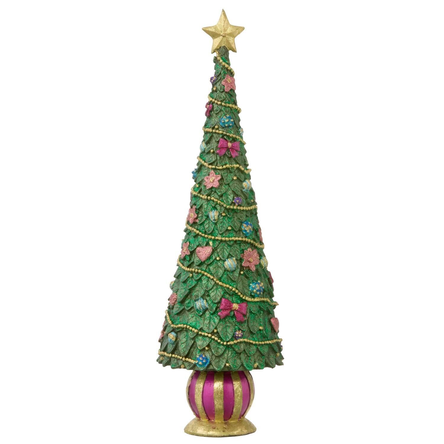 Bring farve og glæde ind i julen med dette grønne juletræ på stribet fod. Pyntet med blomster, hjerter og guldgarner, afsluttet med en gylden stjerne på toppen.