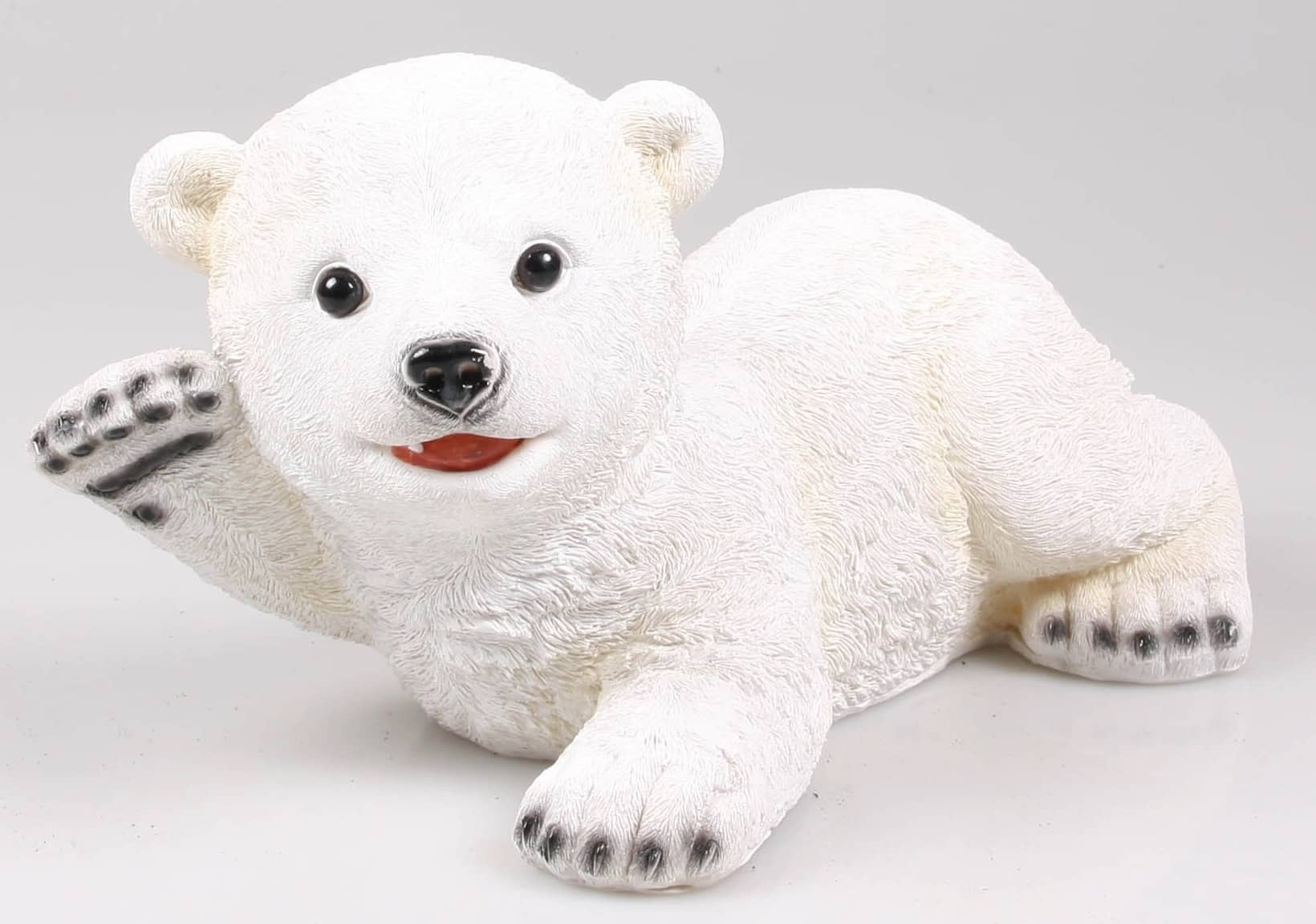Sød, liggende isbjørneunge, der med et venligt udtryk og en glad vinkende pote skaber masser af vinterstemning i hjemmet. Den detaljerede struktur i pelsen og de fine skygger omkring øjne og poter giver figuren et livagtigt og charmerende udtryk. Isbjørne