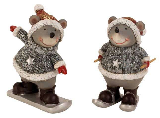Mus i sneen. Grå snemus i 2 varianter; på enten ski eller snowboard. Måler 13 cm i højden.
