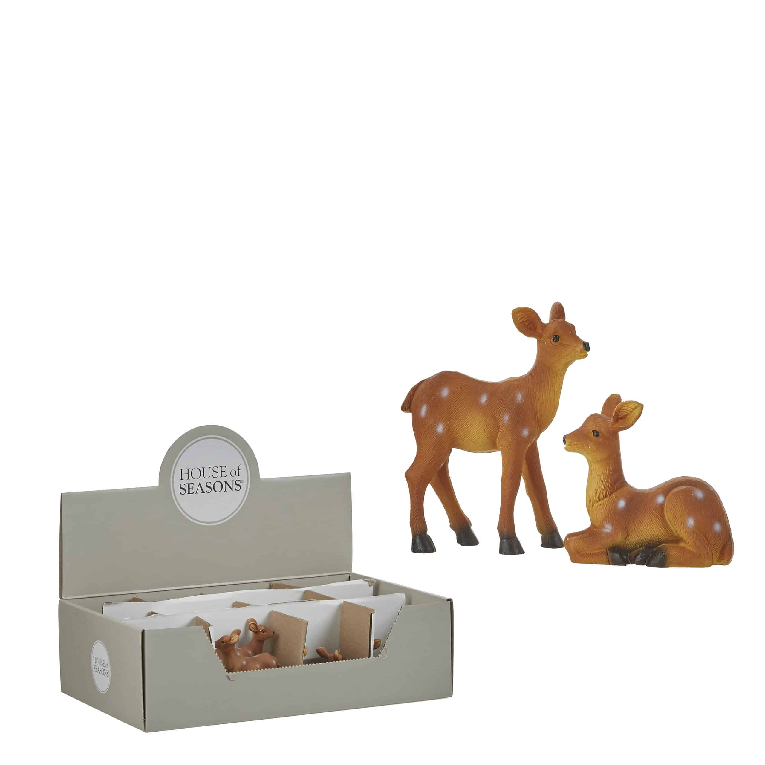 Rådyr. Små rådyr i to varianter enten stående eller liggende. Mål:Længde: 6 cmDiameter: 2,5 cmHøjde: 5 cm Pakket med 1 stk.