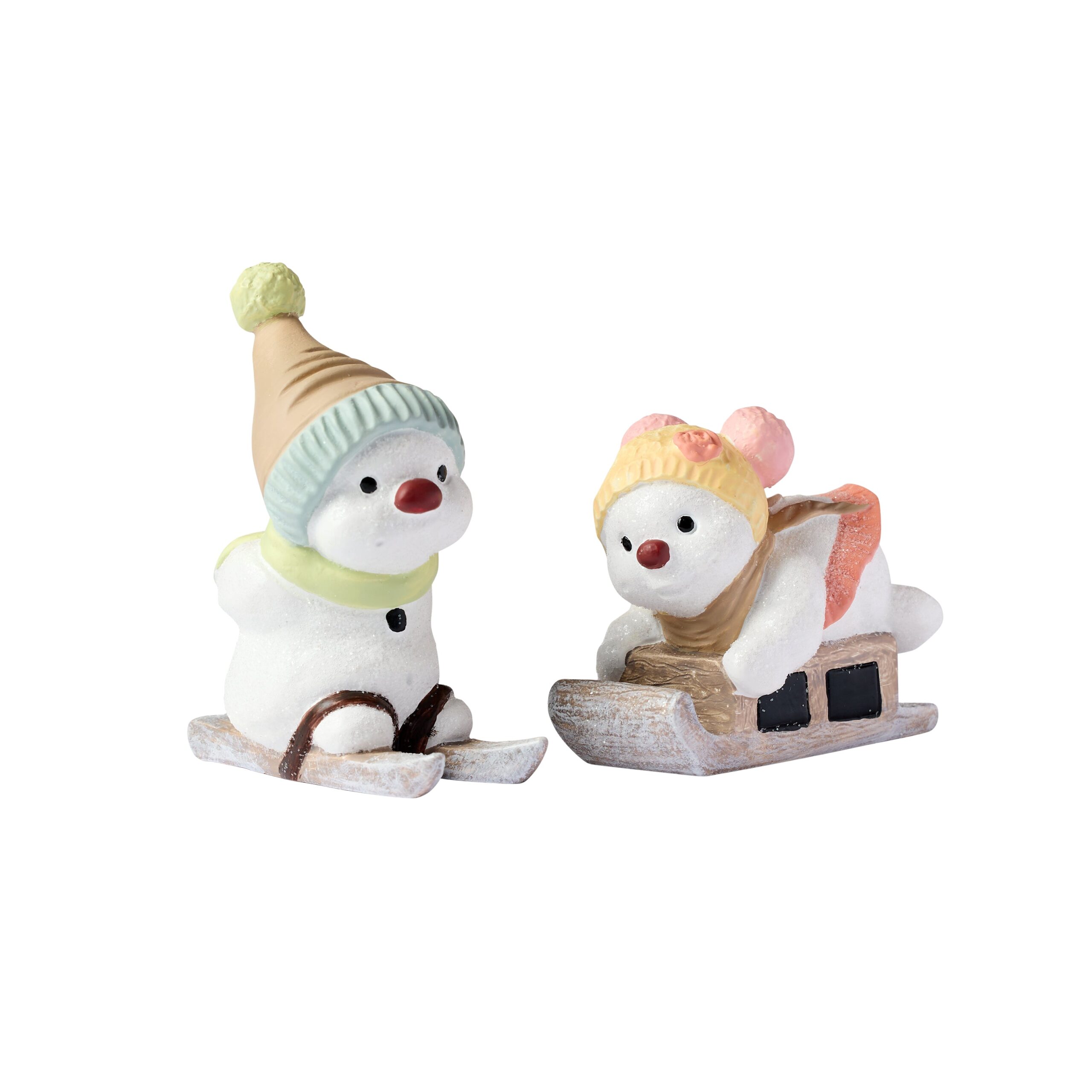 Snemænd 2025 består af Vina & Vesti. Vesti er glad nisse nisse, med en fin blå hue på. Vina ligger fladt på sin kælk med sin lyserøde og gule hue.
